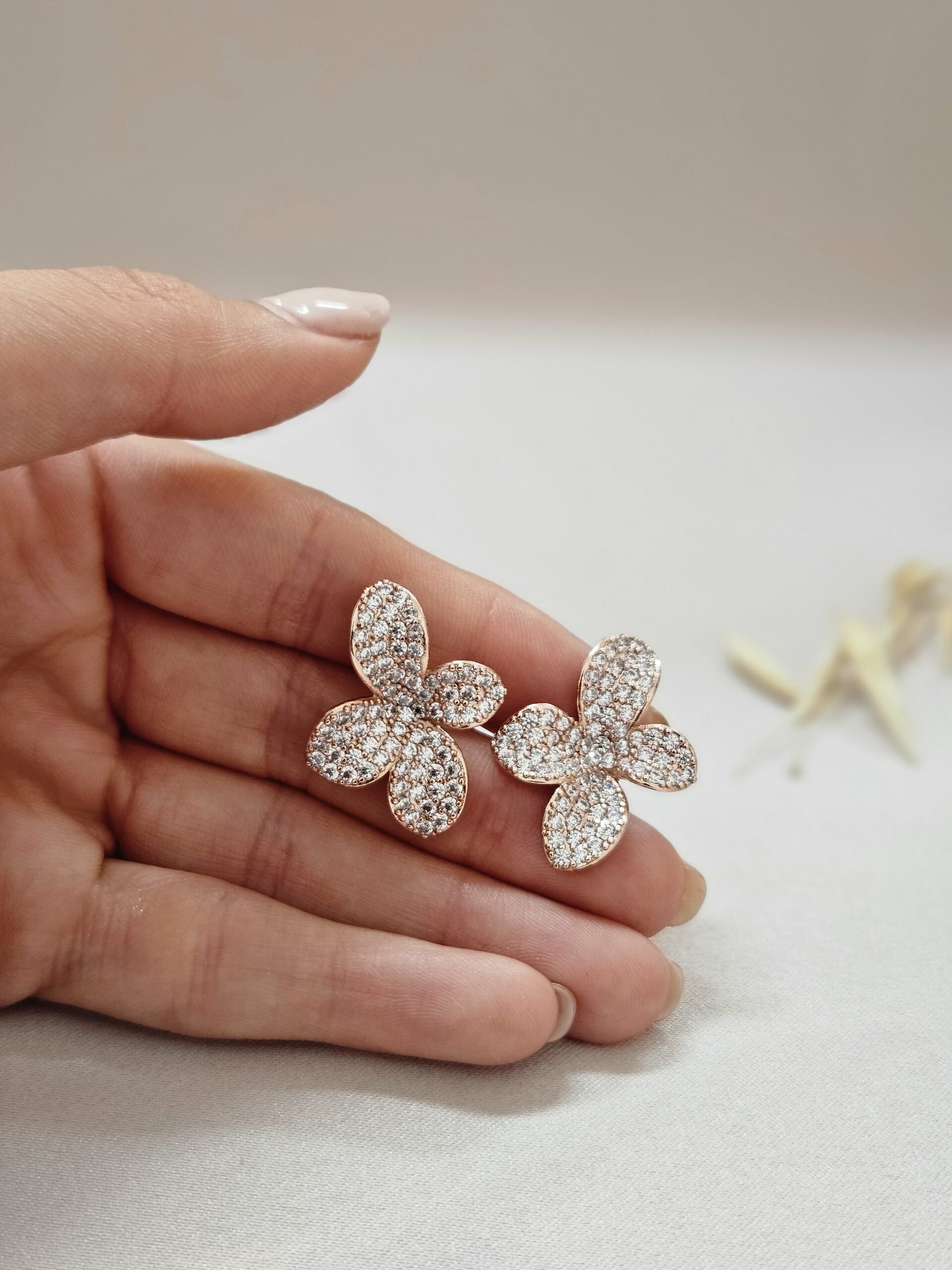 Delicately designed in a graceful floral shape, these rose gold stud earrings sparkle with high-quality clear zirconia crystals that catch the light from every angle. The soft rose gold finish adds a warm, romantic touch, making them a timeless addition to any jewelry collection.
