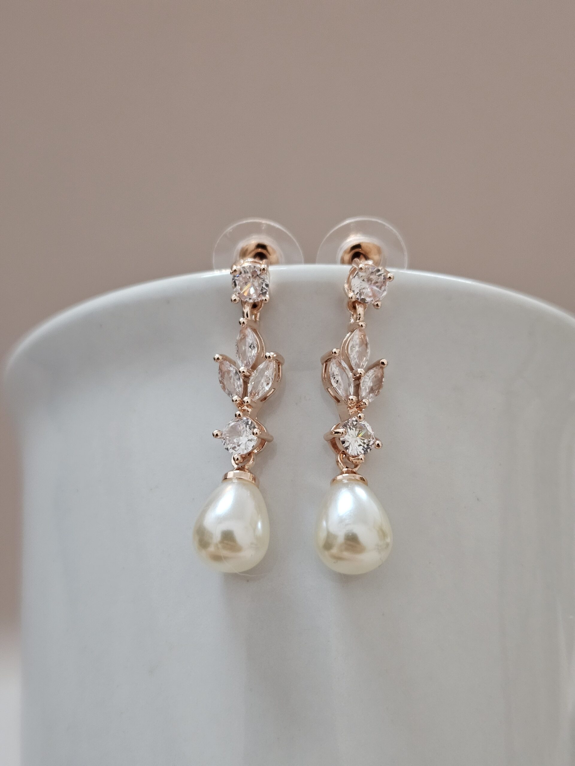 These rose gold drop earrings are a beautiful expression of timeless elegance and refined femininity. Designed to complement bridal and formal looks, they feature a graceful arrangement of sparkling marquise and round-cut cubic zirconia stones set in a warm rose gold finish. At the end of each earring, a soft teardrop faux pearl adds a classic, vintage-inspired touch that moves gently with every step.