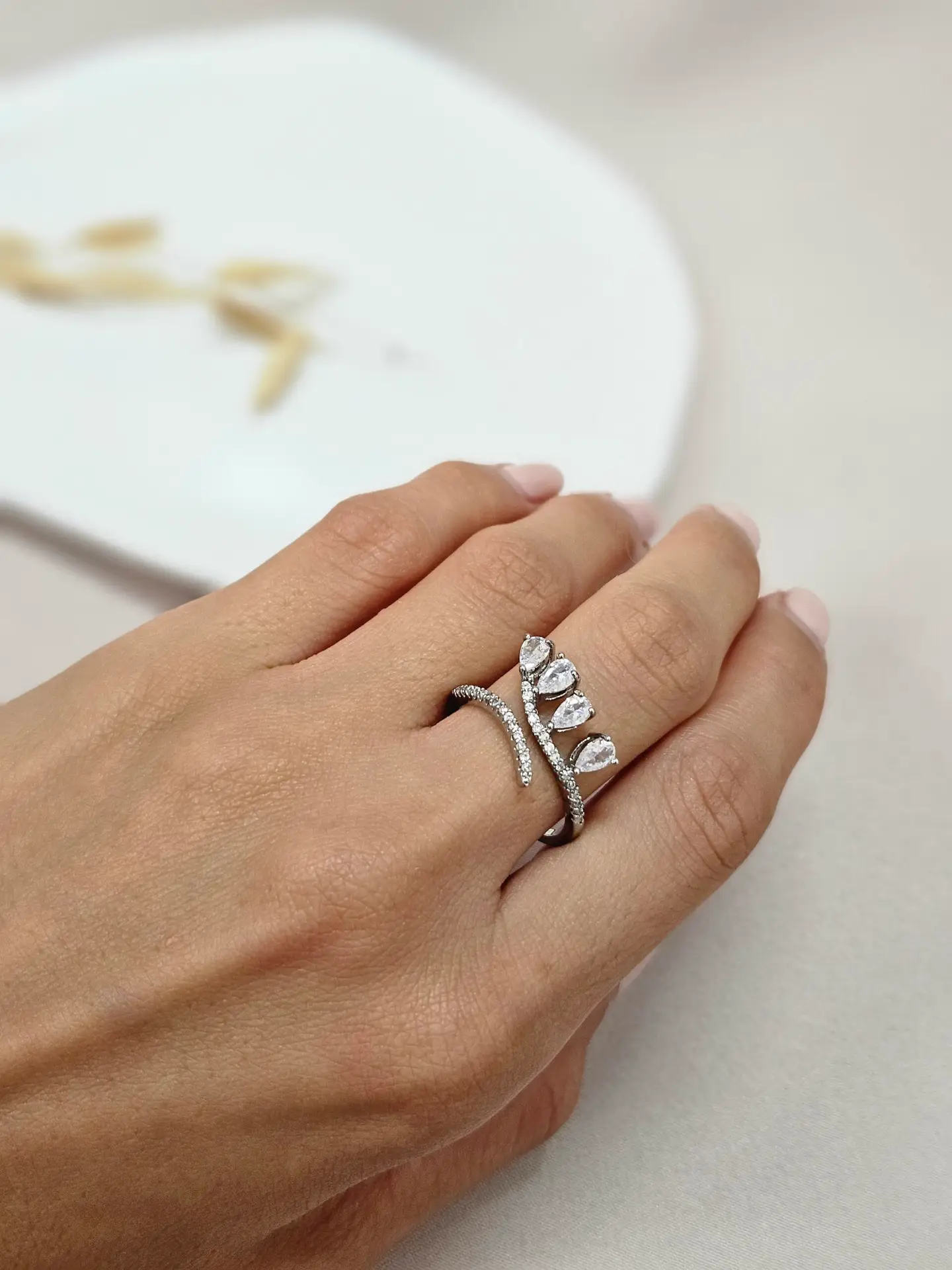 Its open cuff structure offers an adjustable fit, making it both practical and versatile. Lightweight and effortless to wear, this piece adds a modern, feminine touch, whether worn alone or stacked with other rings