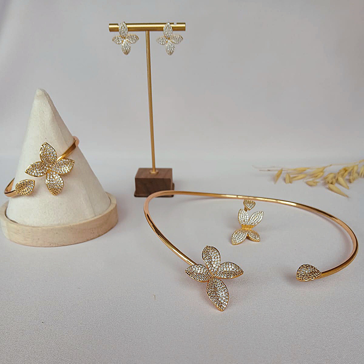 Add a touch of timeless elegance to your look with this stunning gold floral jewelry set, featuring a harmonious combination of delicate flower motifs and sparkling crystal details.
