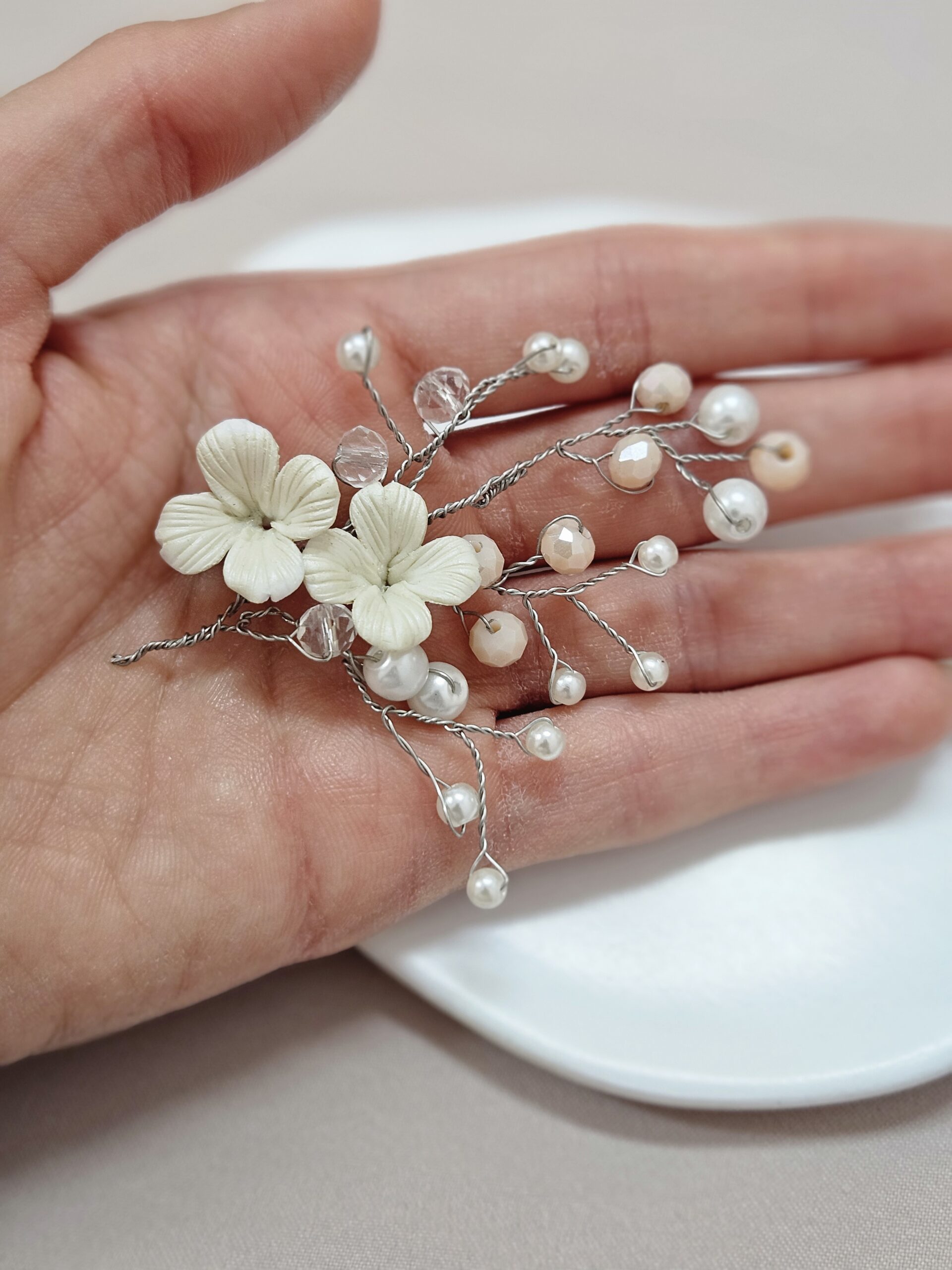 A dainty and romantic accessory handcrafted with soft pink pearls arranged into a lush floral design. Its petite size makes it versatile and easy to place in any hairstyle, whether tucked beside a bun, pinned into a braid, or added as a delicate accent to loose waves.