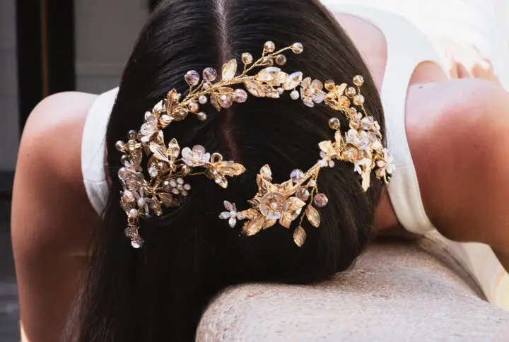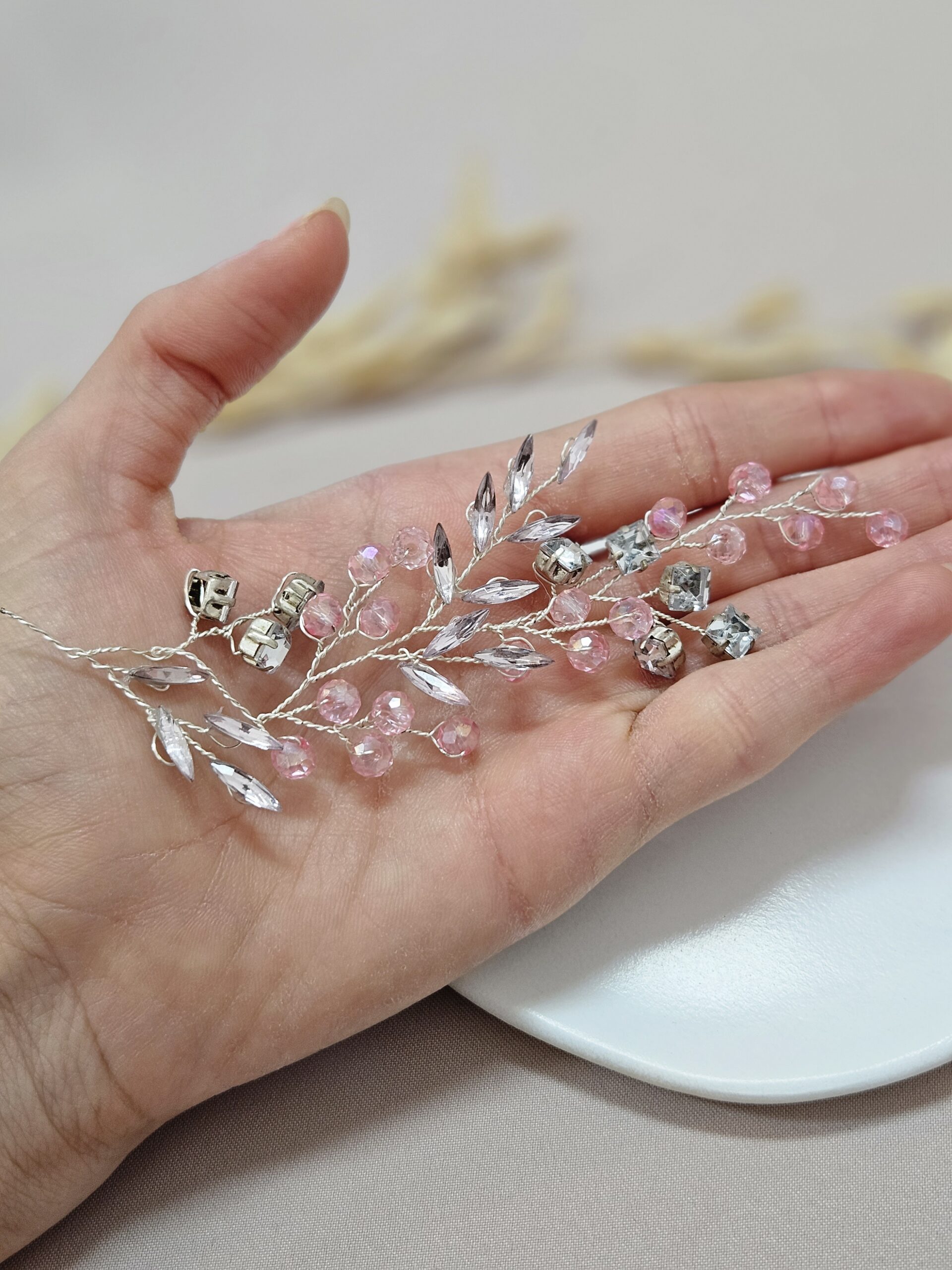 A romantic and feminine accessory designed with soft blush pink accents set on a silver base. The delicate floral-inspired design combines crystals and beads with pink details, creating a graceful shimmer that beautifully complements bridal and formal looks.