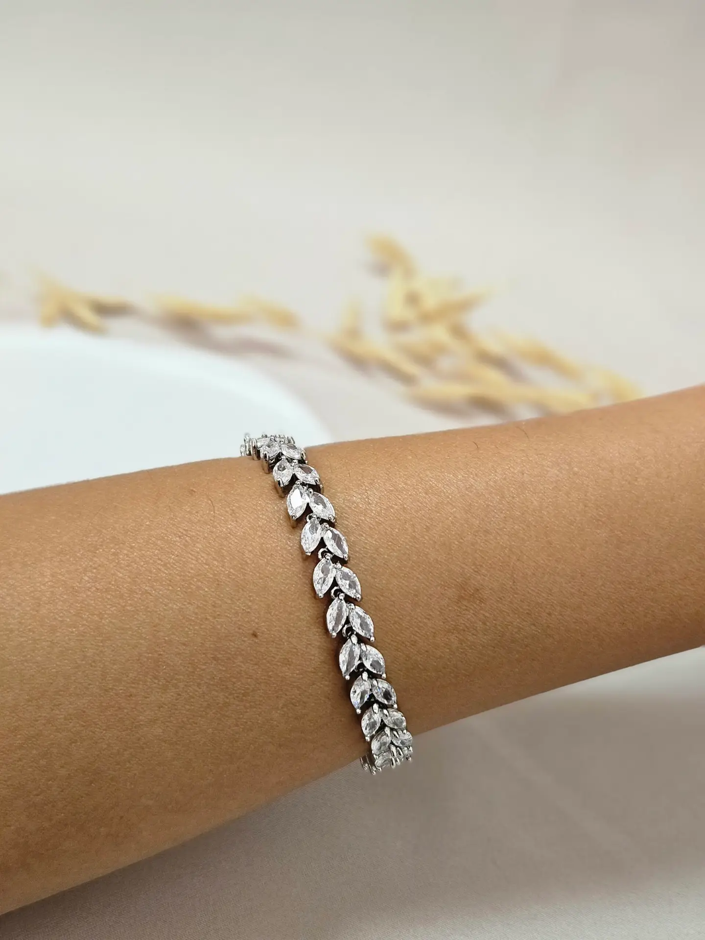 A minimalist leaf crystal silver bracelet features leaves that add a subtle nature-inspired touch, while the slim, modern silhouette keeps the look clean and elegant. The crystals provide a hint of sparkle without overwhelming the simple design.