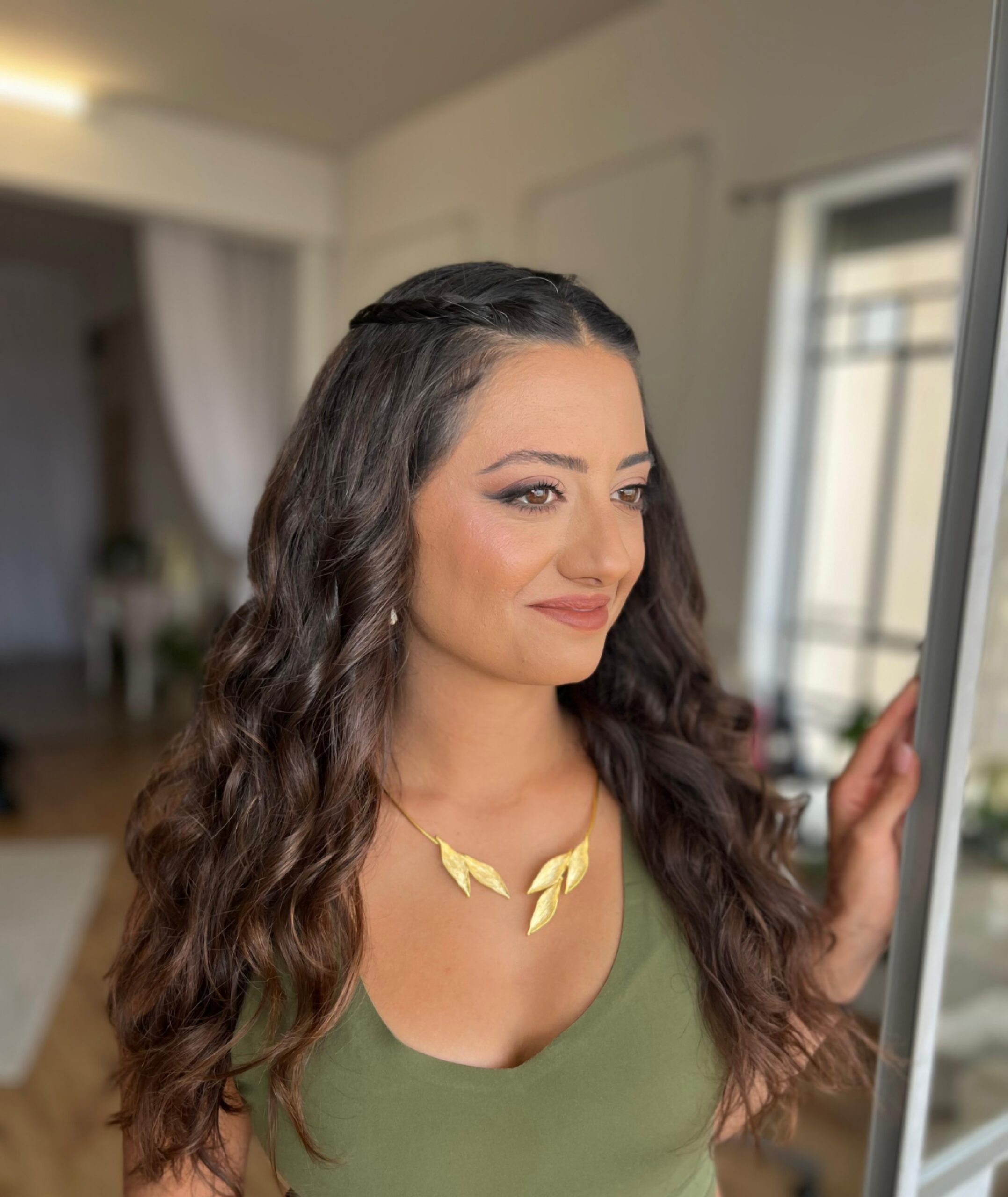 Embrace effortless elegance with this 18K gold-plated olive branch statement necklace, featuring a stunning design inspired by the graceful beauty of nature. Crafted with textured, overlapping leaves, the necklace shimmers beautifully with every movement — a perfect blend of organic charm and modern sophistication.