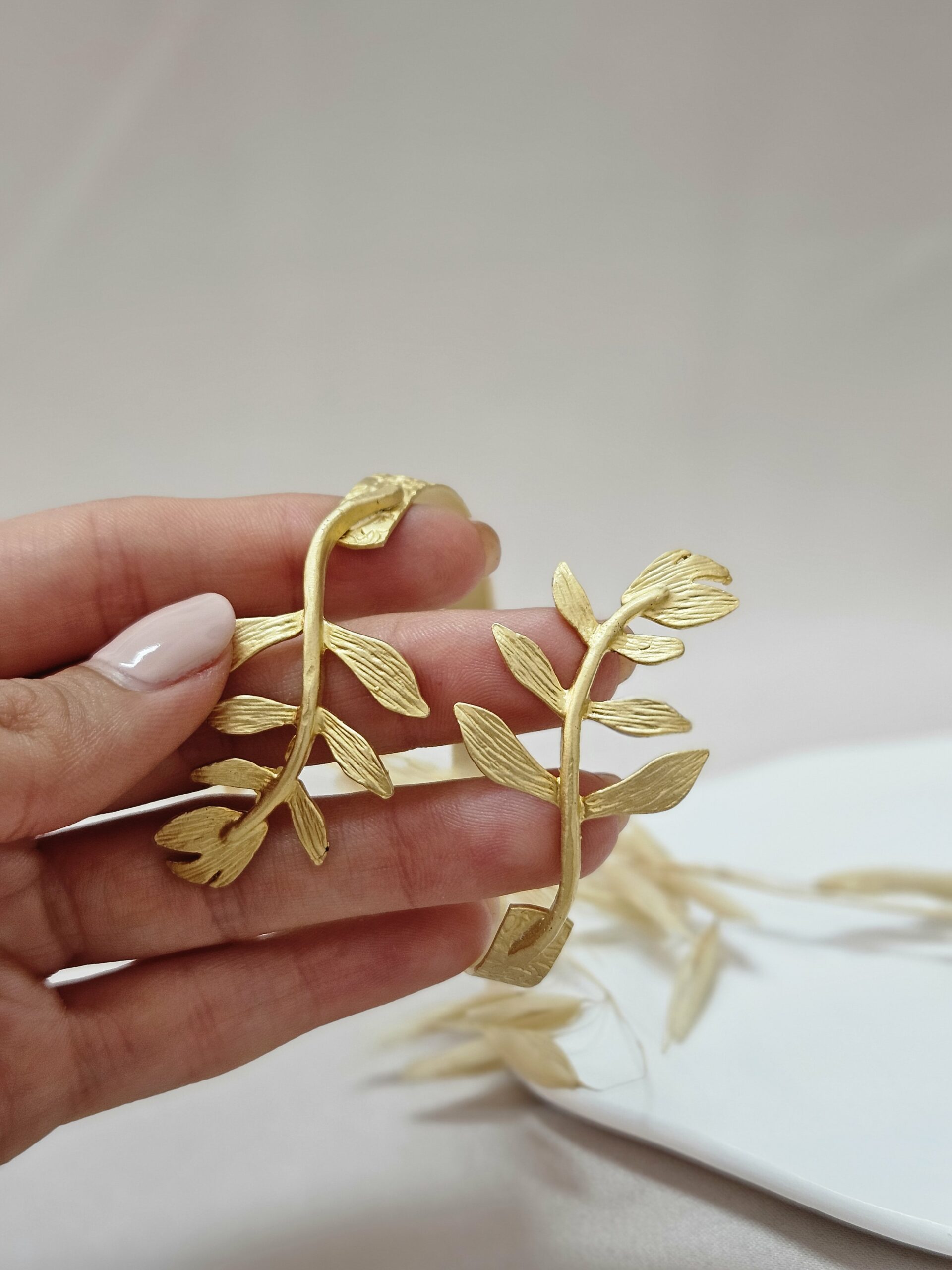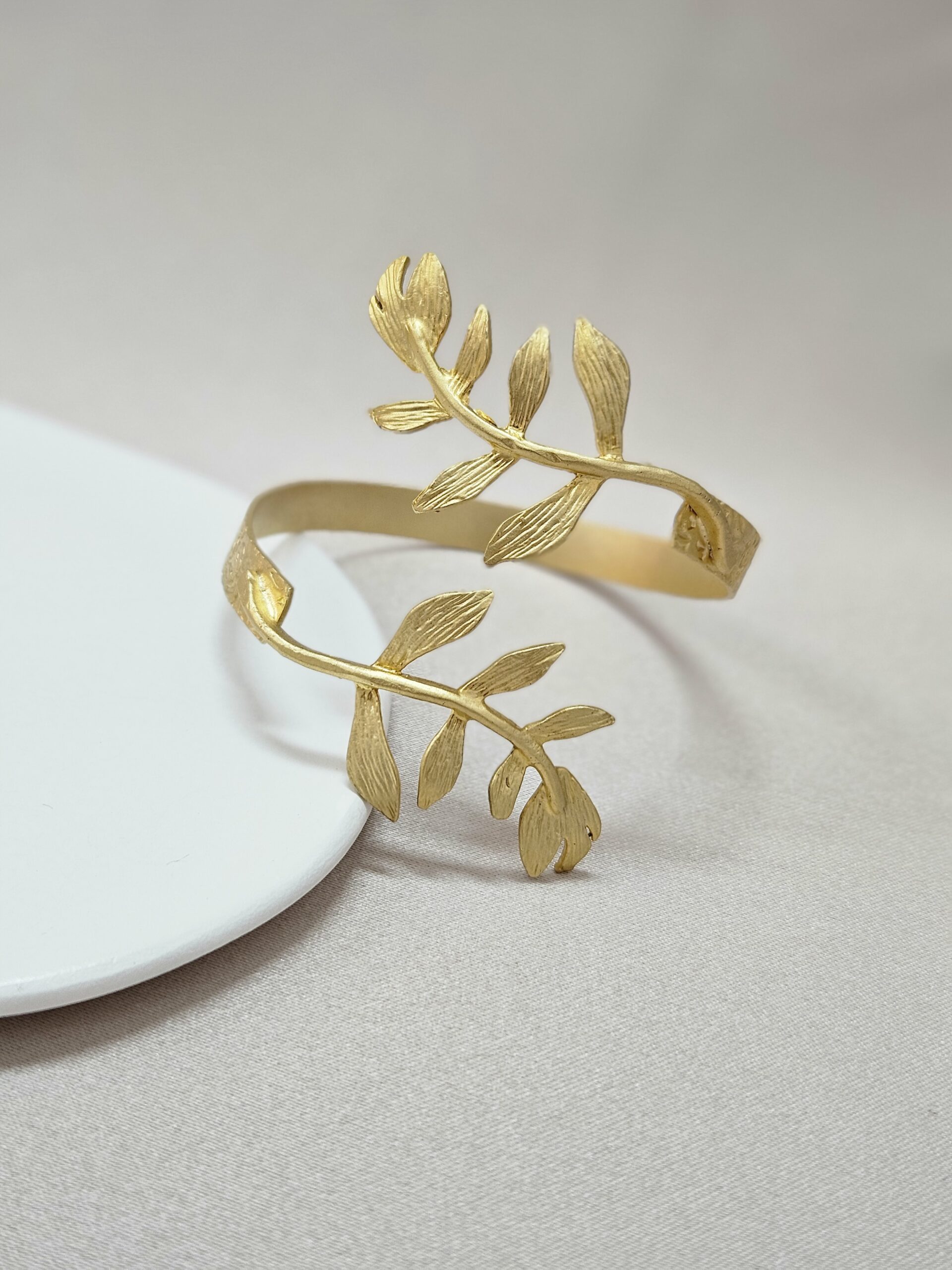 This bold cuff bracelet draws inspiration from ancient Greek motifs, featuring intricately crafted gold leaves that wrap gracefully around the wrist. The design mimics the look of laurel wreaths—symbols of victory and honor in Greek mythology—bringing a sense of timeless elegance and strength. With its rich gold finish and open cuff silhouette, the bracelet makes a powerful yet graceful statement.