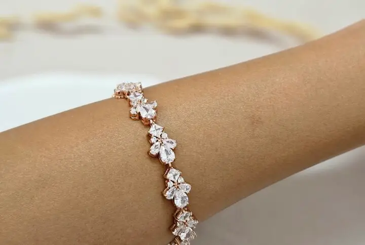 • Bracelets: Two open bangles featuring pineapple-shaped designs. Each piece is adorned with a large, faceted champagne crystal accented by smaller marquise-cut crystals arranged to resemble pineapple leaves. The twisted band adds a refined detail to the design.