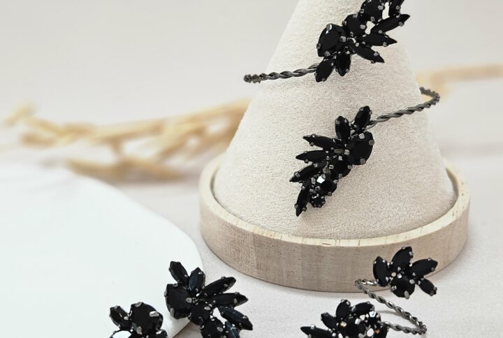 This Greek-inspired silver leaf jewelry set includes a sculptural cuff bracelet, stud earrings, and an adjustable ring, all designed with intricately detailed oak leaf motifs in an antiqued silver finish. The wrap-around cuff elegantly curves around the wrist with three bold leaves, while the matching stud earrings and double-leaf ring add a cohesive yet understated touch. Ideal for cultural events, Grecian-themed weddings, or elegant evenings, this set pairs beautifully with off-the-shoulder dresses or flowing fabrics in white, cream, or deep jewel tones. With adjustable features for comfort and fit, it’s perfect for those who appreciate nature-inspired, mythological, or artisan-style accessories that make a timeless statement.